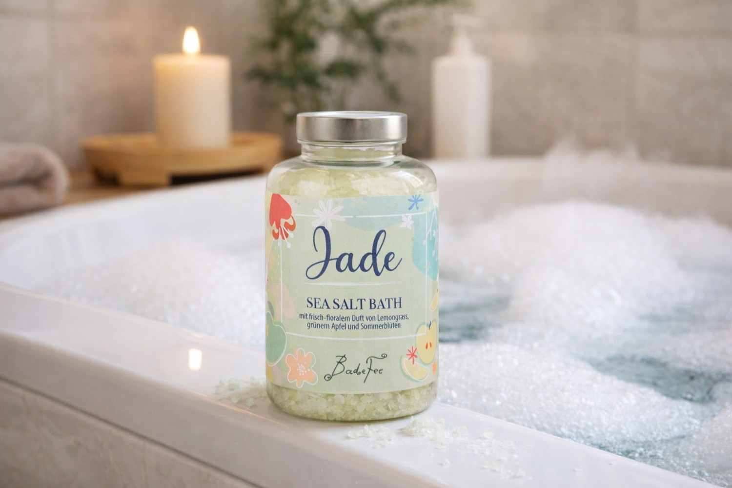 Badefee Badesalz Jade 500 g – Meersalzkristalle mit grünem Apfel, Zitronengras & Sommerblüten