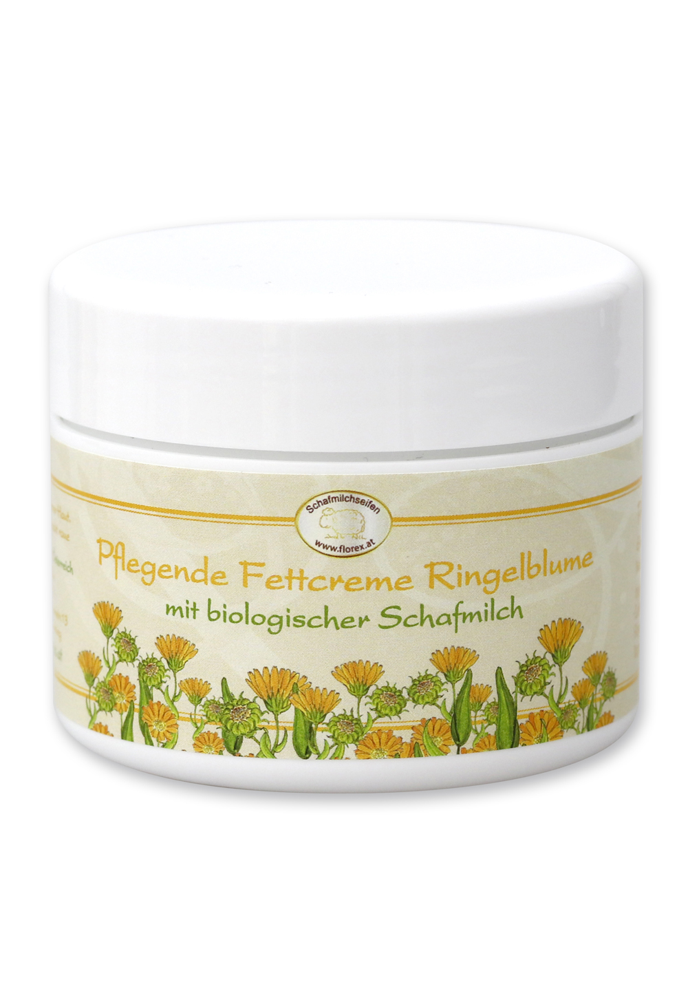 Fettcreme mit Ringelblume von Florex mit kostbaren Inhaltsstoffen. Zur täglichen Pflege bei extrem trockener Haut. Auch als Kälteschutz. Hergestellt nach einem traditionellen Hausrezept. Hervorragende Creme zur Hautpflege mit erlesenen Inhaltsstoffen. Das enthaltene Ringelblumenöl wirkt regenerierend und macht raue Haut widerstandsfähig. Ideal geeignet bei extrem trockener Haut. Das enthaltene Ringelblumenöl wirkt regenerierend und macht raue Haut widerstandsfähig. Mit Bienenwachs, Lanolin und Ringelblumenextrakt. Mit biologischer Schafmilch aus Österreich.