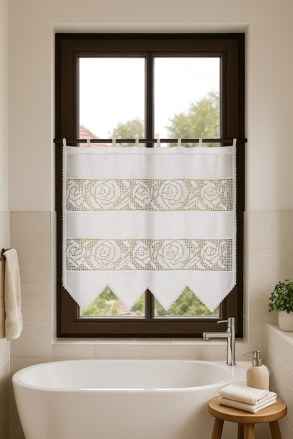Diese Gardine verleiht jedem Raum einen Hauch von Romantik und nostalgischem Charme. Der halbtransparente Stoff sorgt für ein angenehmes, sanftes Lichtspiel und bewahrt gleichzeitig die gewünschte Privatsphäre. Besonders edel wirkt die handgehäkelte Spitze, die am unteren Abschluss romantische Akzente setzt und mit dem Stangendurchzug eine einfache Befestigung ermöglicht.